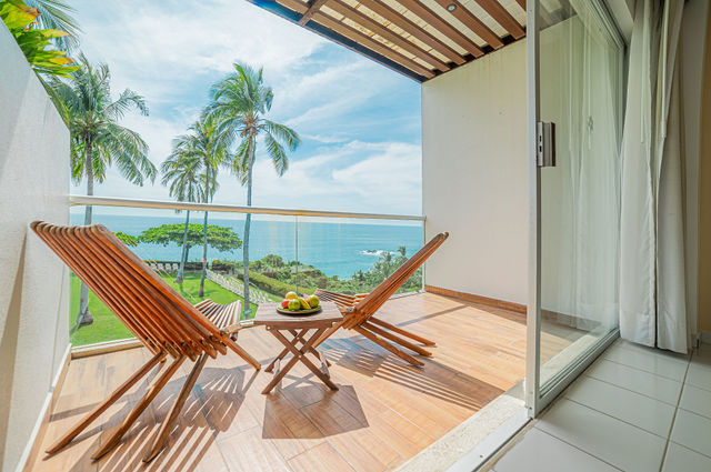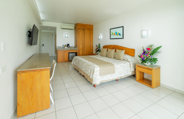 Con una amplia terraza y extraordinaria vista al mar. Cómoda y espaciosa habitación, con aire acondicionado, pantalla HD de 40", teléfono, cafetera, escritorio, secadora de pelo, caja de seguridad, mini refrigerador y wifi gratis.Elegante baño revestido de mármol, con ducha de vidrio templado y tocador bien iluminado. Para su comodidad, puede elegir con 1 cama King o 2 camas Queen.